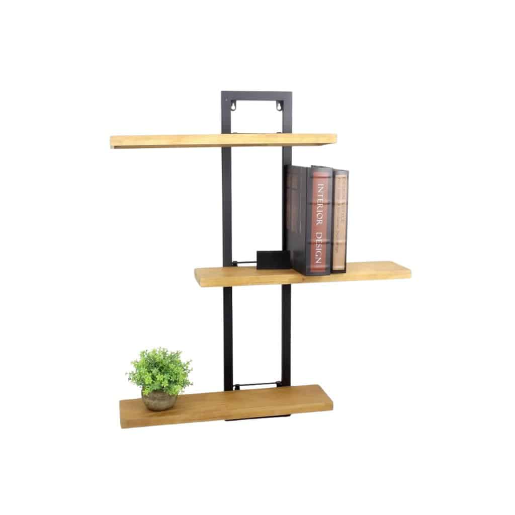 שלוש קומות עץ בגוון טבעי על שלדת מתכת שחורה. עיצוב מודרני עם נוכחות, לתצוגה של ספרים, עציצים ופריטים אהובים.