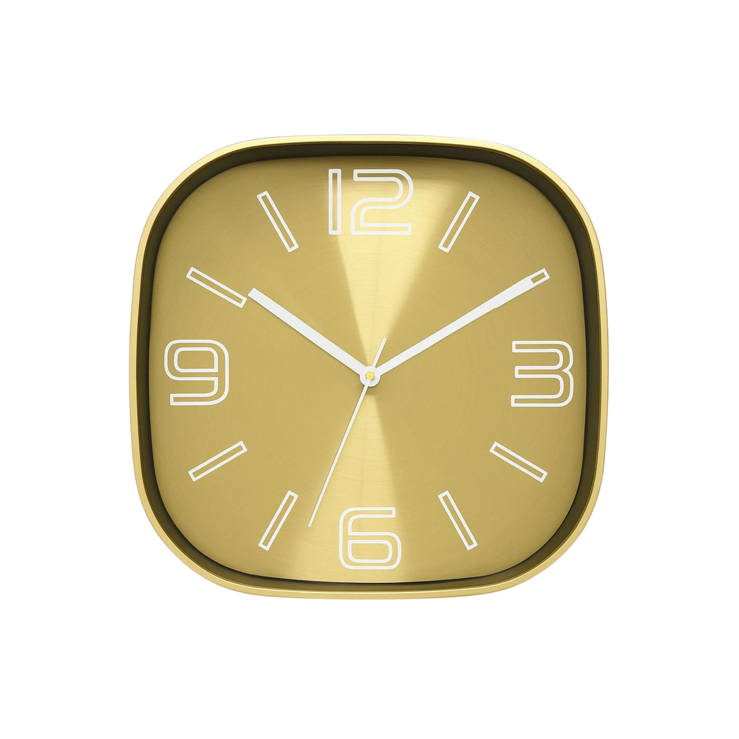 שעון קיר מלבני עם פינות מעוגלות בגימור זהב אלגנטי, עיצוב מינימליסטי ושקט שמתאים למטבח, סלון או משרד. מידות: 29 ס״מ רוחב × 29 ס״מ אורך (מלבני עם פינות מעוגלות).