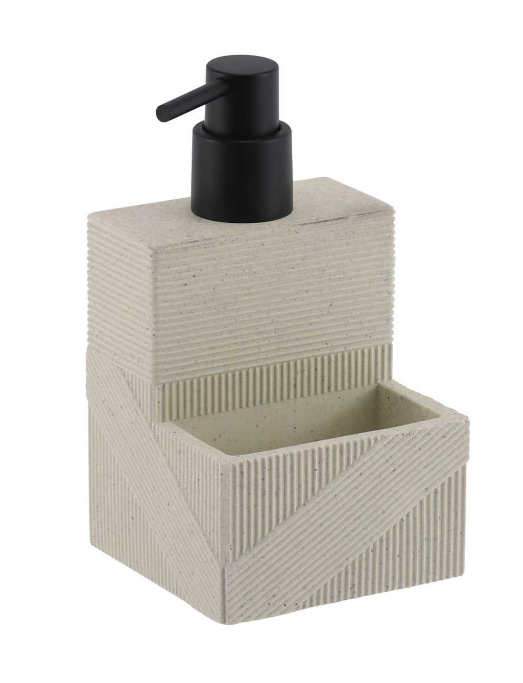 הדיספנסר מתאפיין במבנה גיאומטרי ייחודי בעל טקסטורת פסים אלכסוניים וגימור דמוי אבן טבעית במראה נקבובי עדין, המעניק לו נוכחות יוקרתית ומרשימה. המוצר כולל תא אחסון קדמי מובנה, האידיאלי להנחת ספוג כלים במטבח או אביזרי טיפוח קטנים בחדר הרחצה, ומשאבה שחורה בגימור מט למראה אורבני ועדכני. זהו הפתרון המושלם למי שמחפש לשלב בין סדר וארגון לבין עיצוב מוקפד שמוסיף אופי וסטייל לכל חלל.