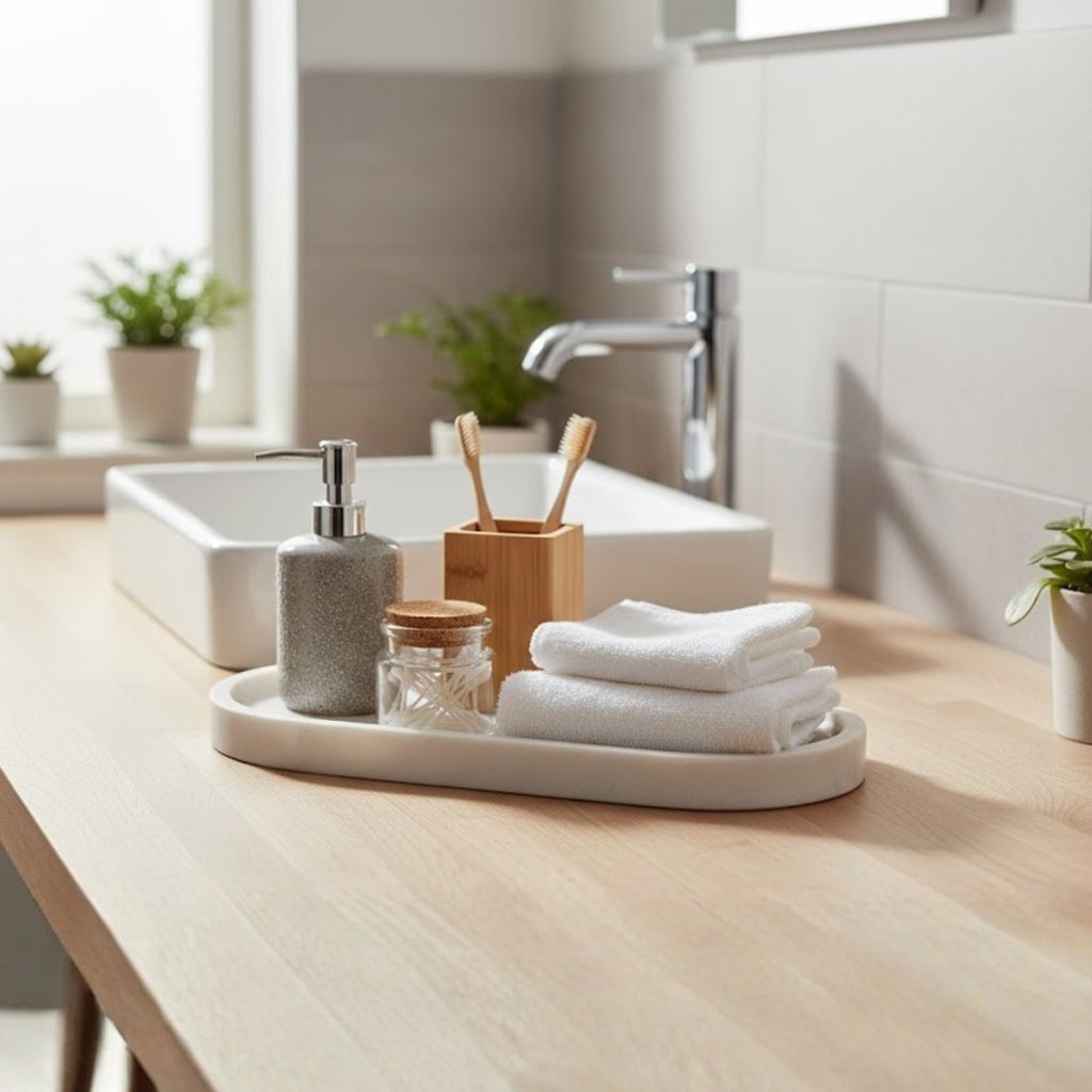 מגש שיש לבן קלאסי- המגש, שמעוצב בקווים נקיים ומודרניים, עשוי שיש איכותי בגווני לבן עם ורידים אפורים עדינים המעניקים לכל פריט מראה ייחודי במינו. בזכות מידותיו המדויקות , מהווה פתרון מושלם ודקורטיבי לארגון מוצרי טיפוח בחדר הרחצה, להצגת בשמים ותכשיטים על שידת המגירות, או כבסיס מעוצב לנרות ואקססוריז בחלל המגורים. מידות: 30 ס"מ אורך, 15 ס"מ רוחב ו-3 ס"מ גובה