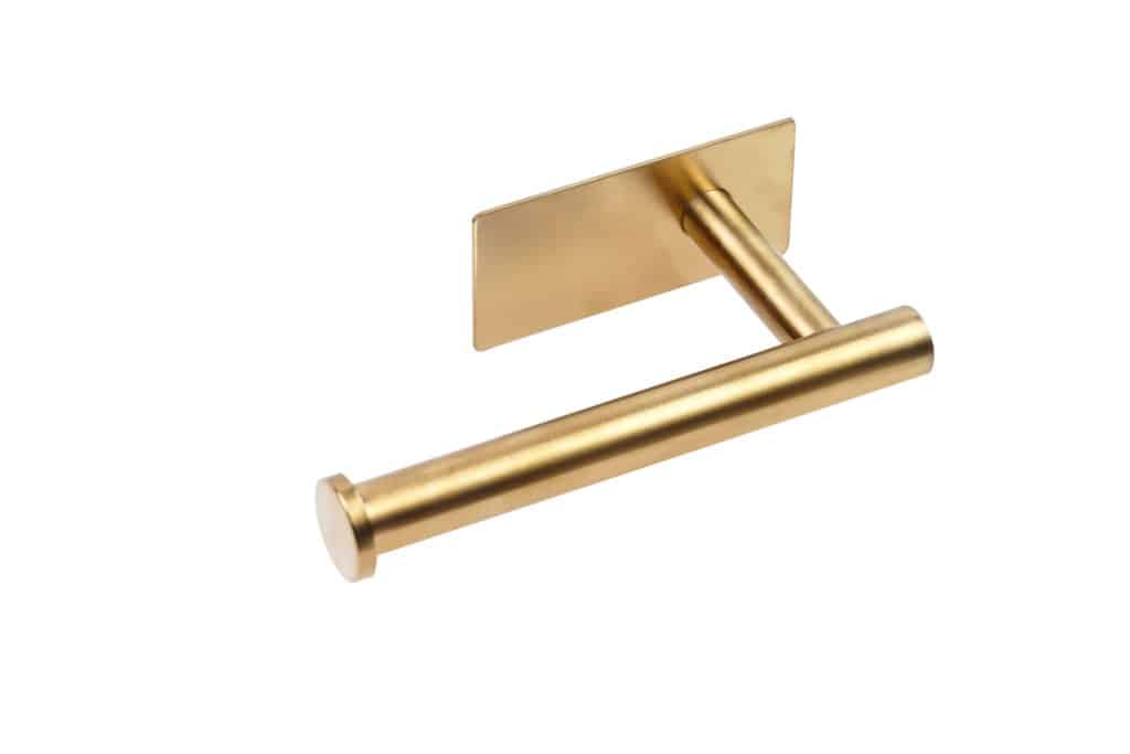 מחזיק נייר טואלט מעוצב בגימור זהב מוברש. המחזיק מותקן בקלות באמצעות הדבקה חזקה, ללא צורך בקדיחה, ומתאים להדבקה על משטחים כמו קרמיקה וזכוכית.