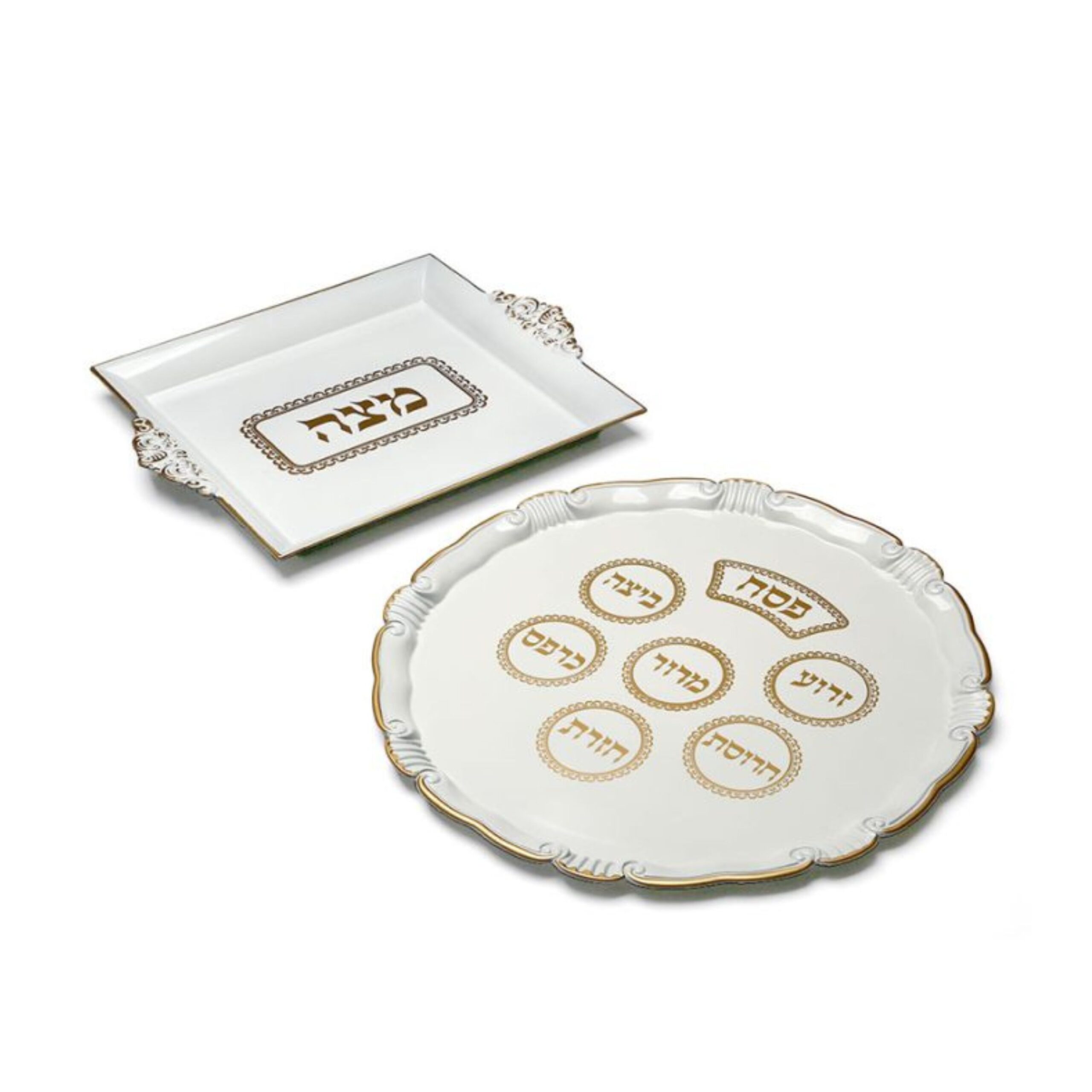 סט לליל הסדר לבן – עשוי מלמין איכותי שנראה ממש כמו קרמיקה יוקרתית עם עיטורי זהב. הסט כולל צלחת סדר עגולה ומרשימה עם כיתוב מוזהב של הברכות(קוטר 33 ס"מ) ומגש מצות תואם (במידות 30 ס"מ,26ס"מ,3ס"מ ) .