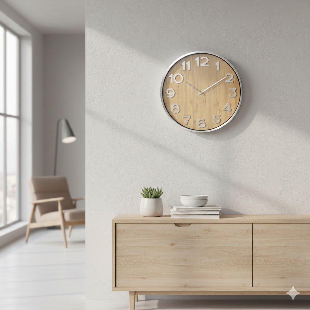 שעון קיר בעיצוב ייחודי המשלב את המראה האורגני של הבמבוק עם הגימור היוקרתי של האלומיניום. השעון מעניק לחלל החדר תחושה נקייה, מודרנית ויוקרתית בו-זמנית. בזכות קוטרו הגדול (50 ס"מ), השעון מהווה אלמנט עיצובי מרכזי, שמתאים באופן מושלם לסלון, למטבח המודרני או למשרד.